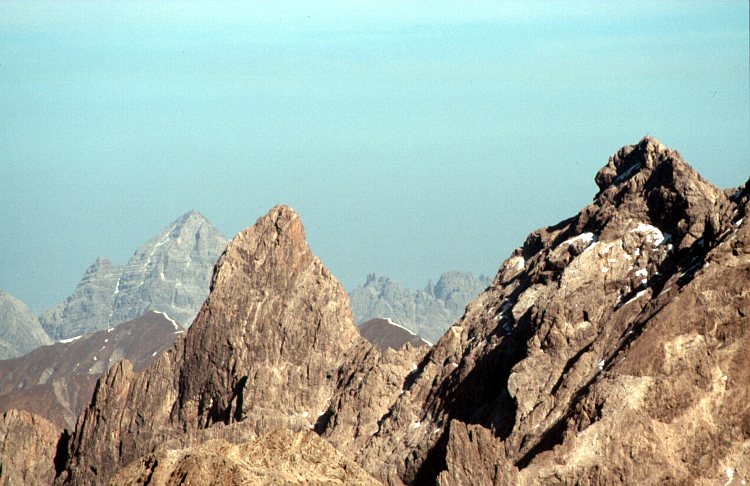 Links der Bildmitte die Trettachspitze (2595 m). Hinten links der Hochvogel (2592 m), rechts die Mädelegabel (2644 m). Blick vom Biberkopf (2599 m) nach Nordosten.