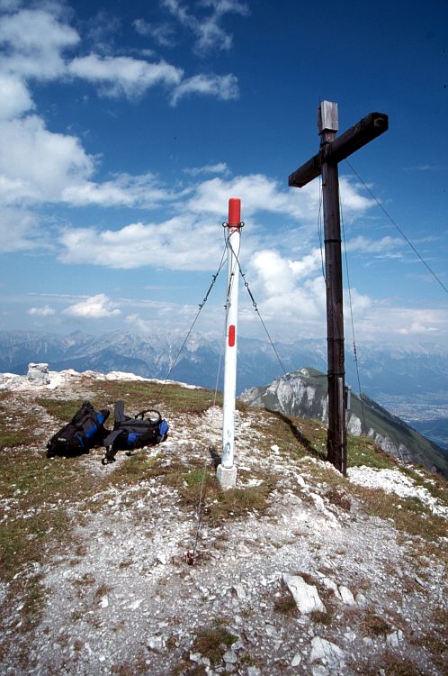 Auf dem Gipfel des Ampfersteins (2556 m) mit seinem Gipfelkreuz. Hinter dem Kreuz die Saile oder Nockspitze (2403 m).