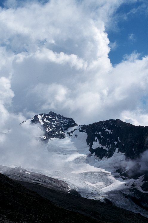 Sonnighorn (3487 m) im Aufstieg zur Almageller Hütte (2894 m). Nach rechts zieht der Sonniggrat hinüber zum Plattenhorn (3324 m). Unten der Rotblattgletscher.