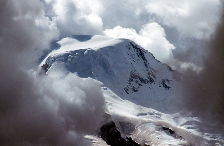 Der breite und wuchtige Alphubel (4207 m) im Aufstieg zur Almageller Hütte (2894 m). Der Blick geht nach Südwesten auf die gegenüberliegende Seite des Saaser Tales.