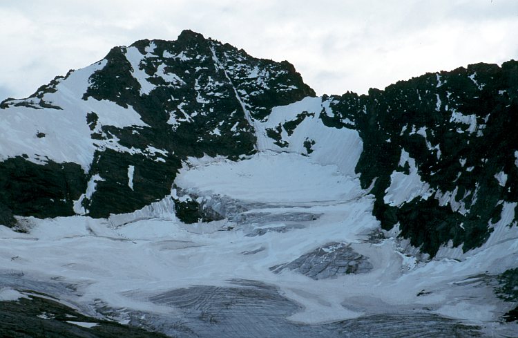 Sonnighorn (3487 m) im Aufstieg zur Almageller Hütte (2894 m). Nach rechts zieht der Sonniggrat hinüber zum Plattenhorn (3324 m). Unten der Rotblattgletscher.