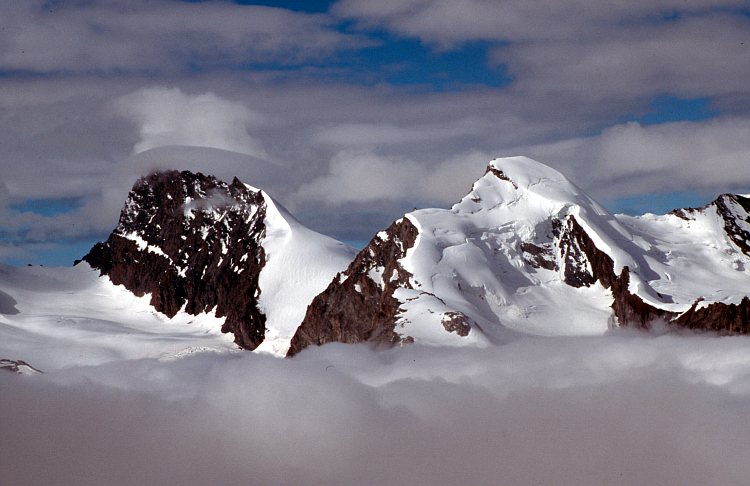 Vom Allalinhorn kommt der Hohlaubgrat herab, daneben der Hohlaubgletscher und rechts der