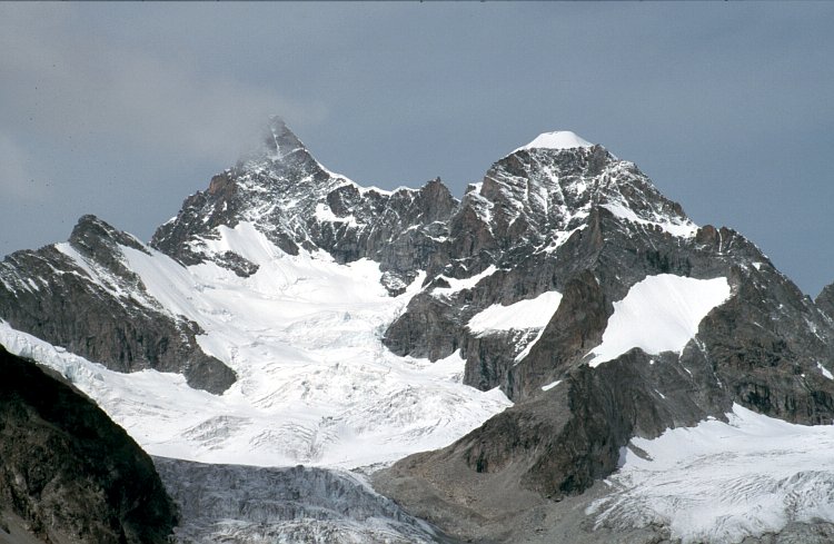 Das Obergabelhorn (4063 m), rechts die Wellenkuppe (3903 m). Davor der Gabelhorngletscher.