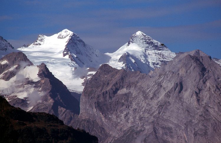Blick nach Südwesten auf die Wetterhörner. Rechts das Wetterhorn (3701 m) und links das Mittelhorn (704 m). Vorne unten das Haslital, das nach links zum Grimsel hinaufzieht.