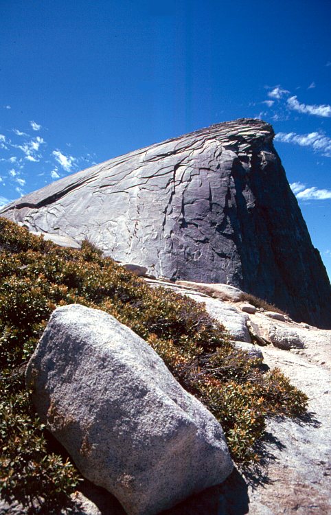 Der Half Dome (2695 m). Die Gipfelschulter erscheint schuppenartig, Seile erleichtern den Aufstieg.