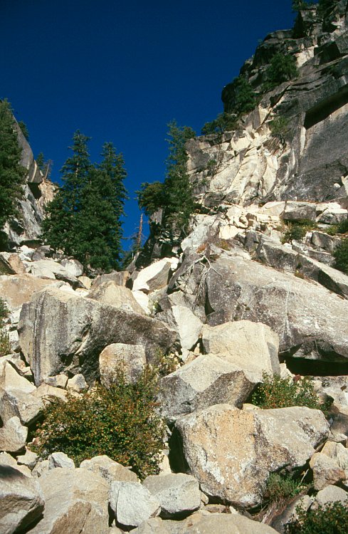 Der Weg hinauf zum Half Dome (2695 m) führt vorbei an Halden mit riesigen Granitblöcken. Weit ist es vom Tal herauf bis zum höchsten Punkt, hin und zurück etwa 27 Kilometer.