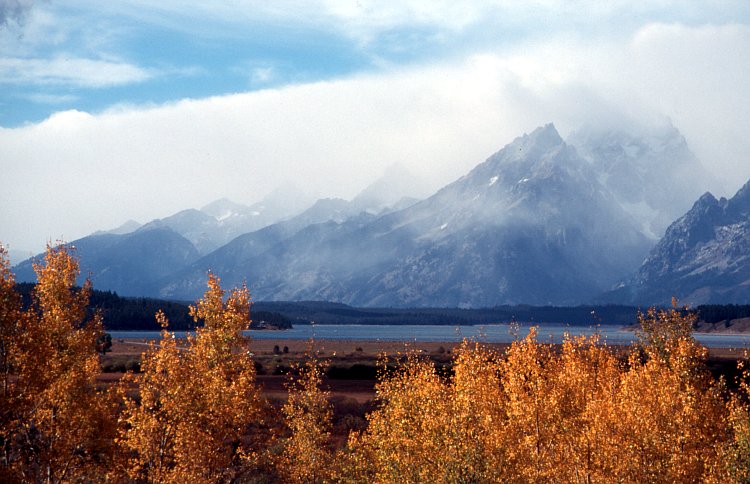 Im Bild rechts der Mount St. John (3484 m), dahinter verschwinden in den Wolken der Mount Owen (3940 m) und der Grand Teton (4197 m).