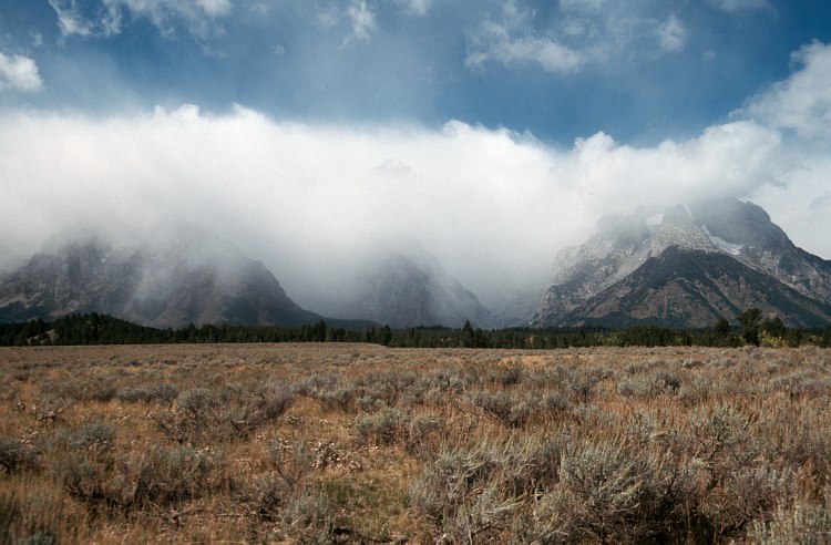 Die Tetons verbergen sich hinter Wolken, aus denen Schnee fällt.