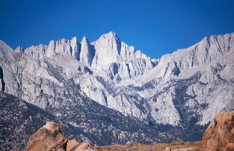 Blick von Osten. In der Bildmitte der Gipfel, daran links anschließend die Keeler Needle und die Day Needle, noch weiter links The Windows und Mount Muir.
