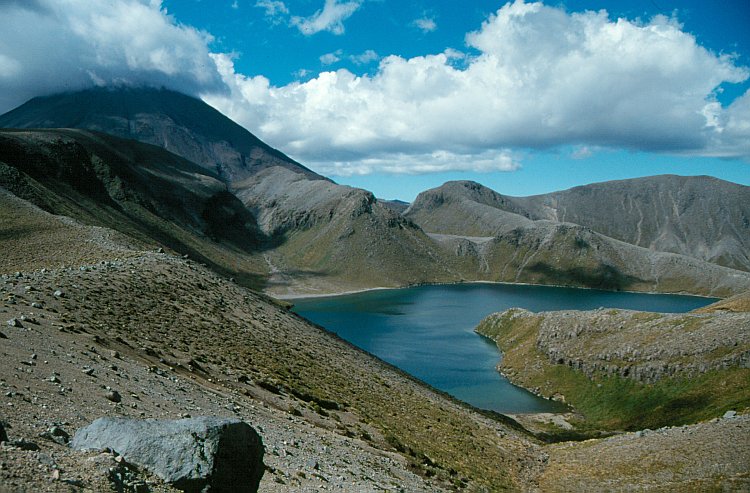 Der Mount Ngauruhoe (2287 m) mit dem Gipfel in Wolken und dem Upper Tama Lake (1314 m).