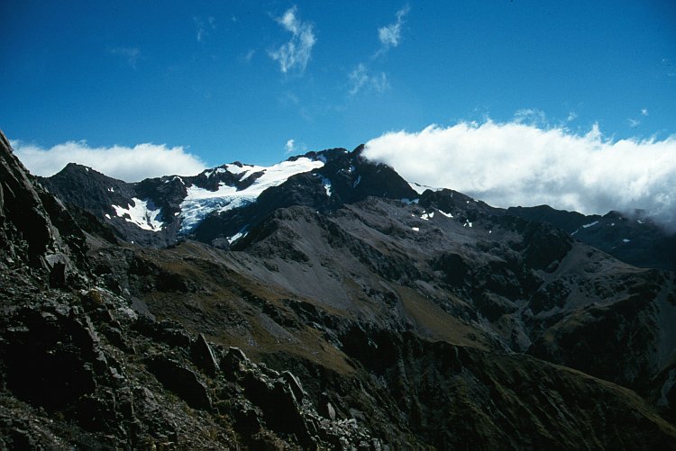 In der Bildmitte der Mount Rolleston (2271 m), links daneben der Crow Glacier mit dem Crow Icefall und Mount Lancelot (2106 m). Nach rechts läuft die Goldney Ridge.