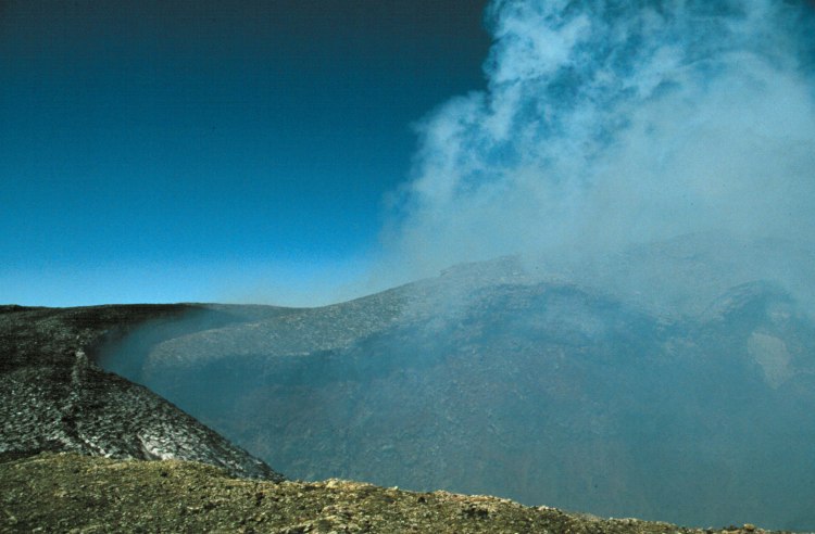 Auf dem Krater des Volcán Villarrica (2840 m). Rauchwolken und Dampfschwaden quellen empor.