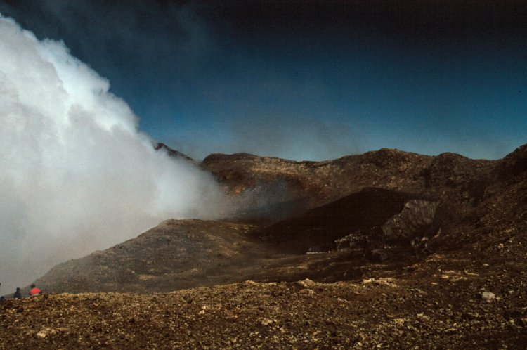 Der Volcán Villarrica (2840 m). Aus dem Krater steigen Rauch- und Dampfwolken mit einigem Getöse empor.