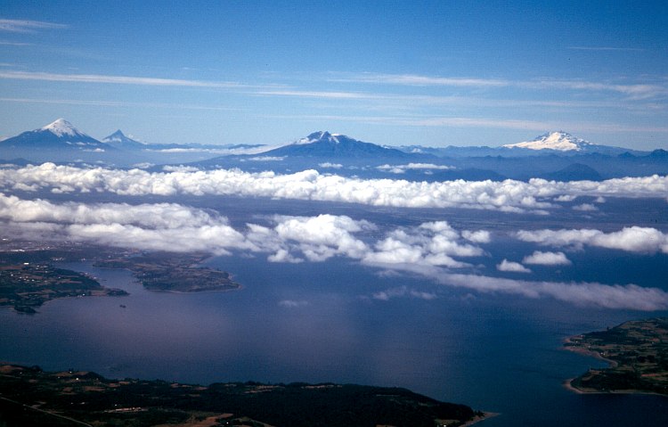 Links der Volcán Osorno (2652 m), knapp rechts daneben der Cerro Puntiagudo (2190 m). In der Bildmitte der Volcán Calbuco (2015 m) und rechts der vergletscherte Monte Tronador (3460 m).