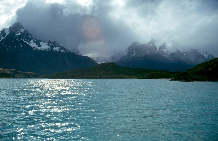 Blick über den Laho Pehoe auf das Cerro Paine Grande Massiv links und die Cuernos del Paine rechts.