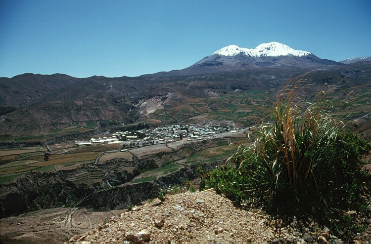 Nevados de Putre mit dem Cerro Larancagua (5408 m) als höchstem Gipfel. Darunter das Dorf Putre (3500 m).