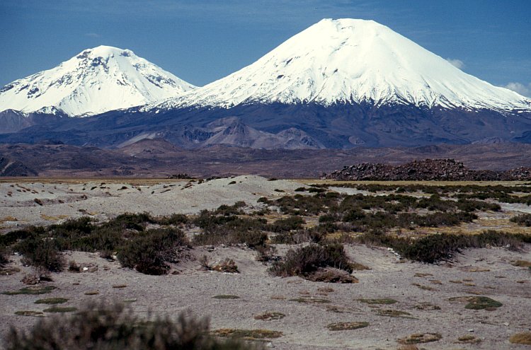Die schneebedeckten Vulkankegel der Nevados de Payachata. Links Volcán Pomerape (6240 m), rechts auf chilenisch-bolivianischer Grenze Volcán Parinacota (6330 m)