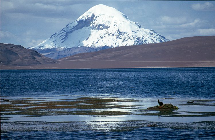 Lago Chungará in Chile (4650 m); Blick auf die Westflanke des höchsten Berges Boliviens (6520 m)