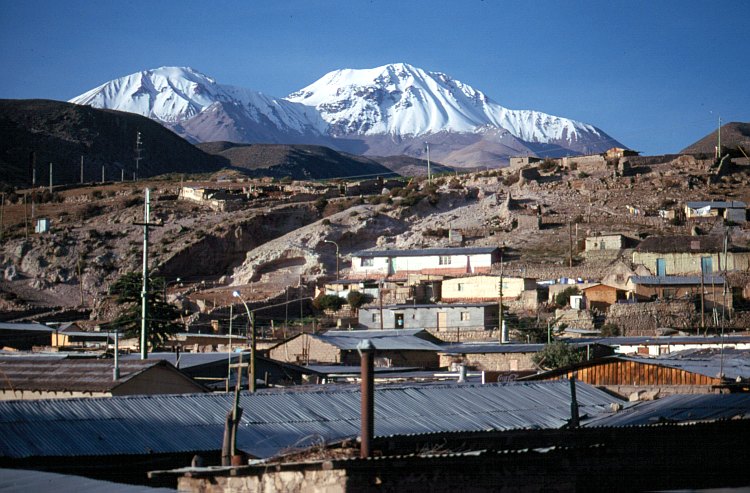 Putre (3500m), darüber die Nevados de Putre mit dem Cerro Larancagua (5408 m) als höchstem Gipfel.