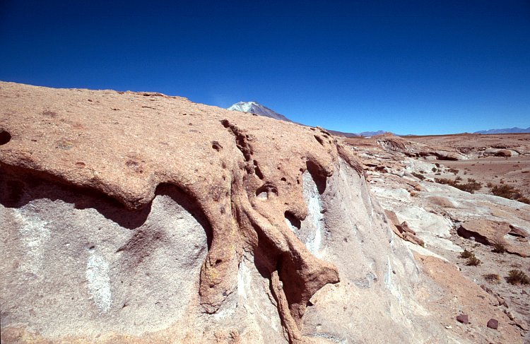 Der aktive Volcán Ollagüe (5870 m) und eigenwillige Lavaformationen.