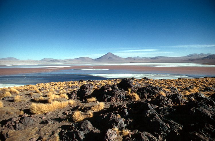Am Südufer der Laguna Colorado (4778 m) erhebt sich der Cerro Pabellón (5498 m).