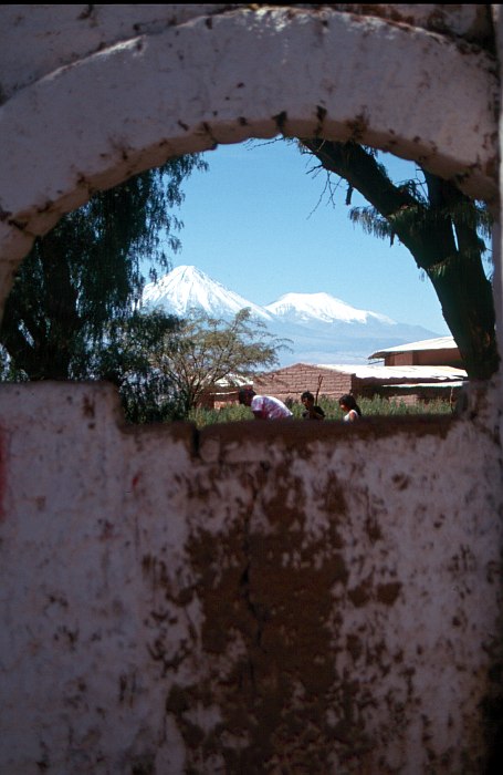 Durch einen Bogen in San Pedro geht der Blick auf den Volcán Licancábur (5916 m) und seinen kleinen Bruder, den Juriques (5704 m).