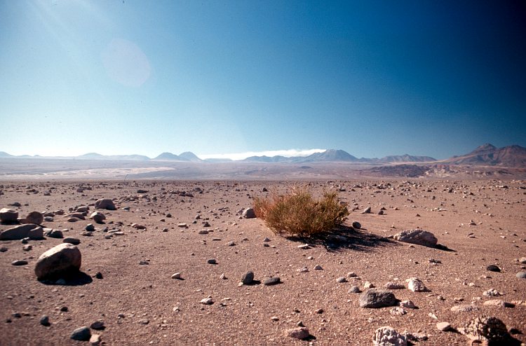 In der Ferne der Volcán Lascar (5592 m), ein aktiver Vulkan mit langer abdriftender Rauchfahne.