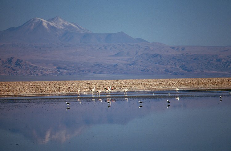 Der Volcán Lascar (5592 m), davor Flamingos in der Laguna Chaxa.
