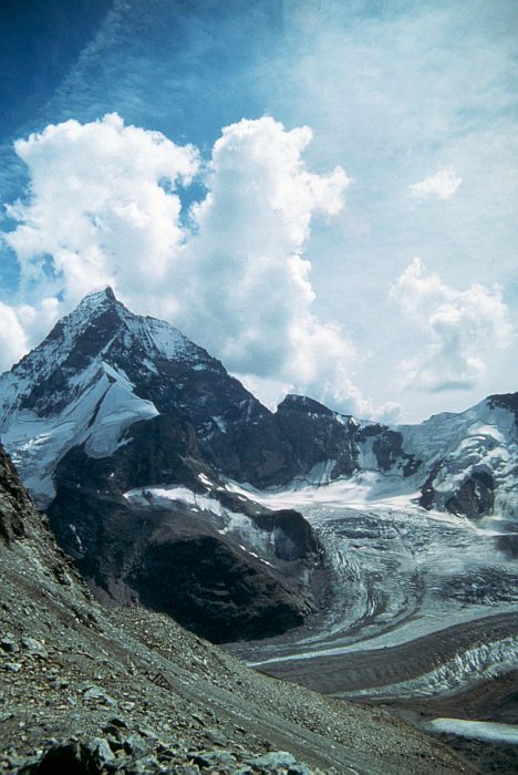 Blick über den Zmuttgrad zum Gipfel, in der Mitte Col de Leone (3580 m), Tête de Leone (3715 m), Col Tournenche (3484 m). Darunter mündet der Tiefmattengletscher in den Zmuttgletscher