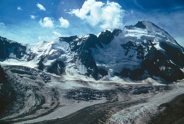 Von links nach rechts: Col de Leone (3580 m) und Tête de Leone (3715), Punta Carrel (3841 m) unter der Wolke und die Dent d'Hérens (4171 m). Darunter der in den Zmuttgletscher mündende Tiefmattengletscher