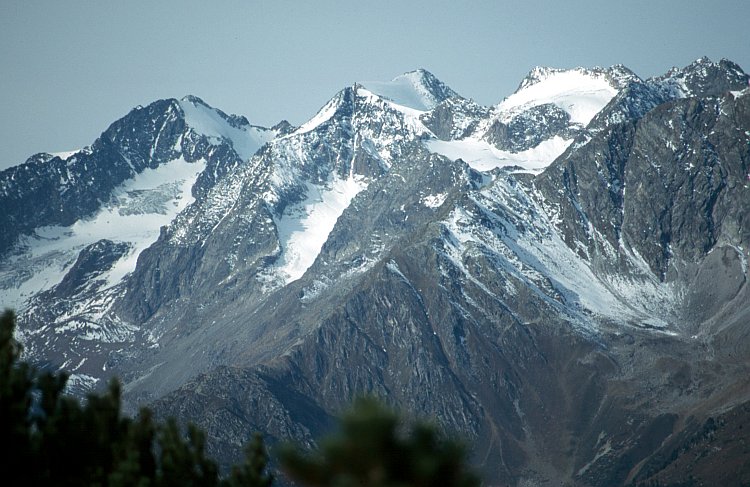 Von links: Die Ruderhof Spitze (3474 m), darunter der Hochmoos Ferner, dann die Östliche Seespitze (3416 m) mit dem Falbesoner Kräul Ferner, rechts die Mittlere Kräul Spitze und der Falbesoner Knoten Ferner.