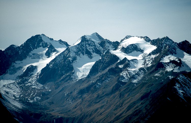 Von links: Die Ruderhof Spitze (3474 m), darunter der Hochmoos Ferner, dann die Östliche Seespitze (3416 m) mit dem Falbesoner Kräul Ferner, rechts die Mittlere Kräul Spitze und der Falbesoner Knoten Ferner.