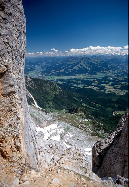 Eine gesicherte Passage im Weg hinab von der Ellmauer Halt (2344 m). Der Tiefblick geht auf die Grutten-Hütte (1620 m). Links im Hintergrund St. Johann.