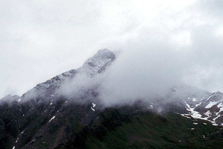 Alle andere als ideales Bergwetter. Nur kurz wird hier einmal der Blick zum Gipfel der Ahorn Spitze (2976 m) frei. Oberhalb von 2500 Meter fiel etwas Neuschnee und hat den Berg überzuckert.