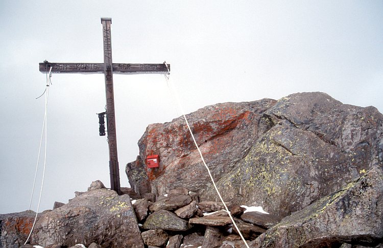 Auf dem Gipfel der Ahorn Spitze (2976 m) mit dem Gipfelkreuz.
