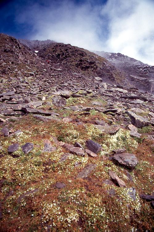 Abstieg von der Ahorn Spitze (2976 m) in der Westflanke; im oberen Bereich steile Geröllfelder.