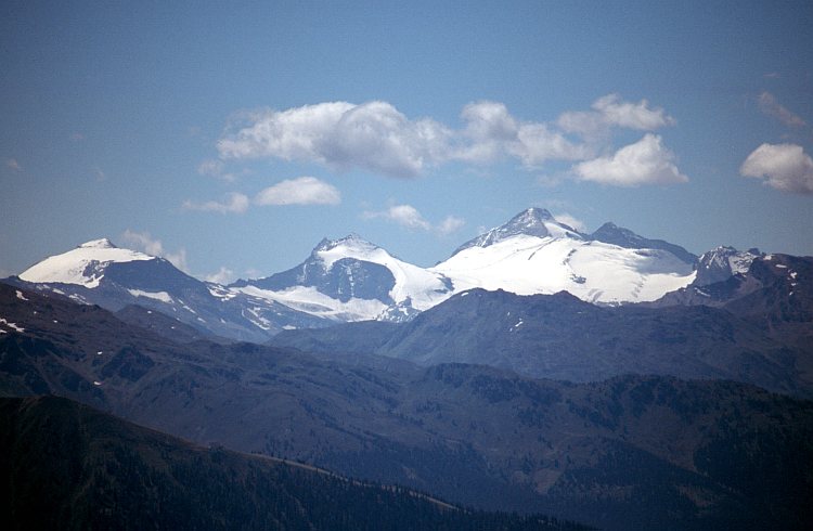 und rechts der Olperer (3476 m). Davor die Gefrorene Wand. Rechts des Olperers der Große Kaserer (3263 m).