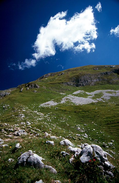 Im Rofangebirge wechseln grüne Grashänge ab mit schroffen Felspartien.