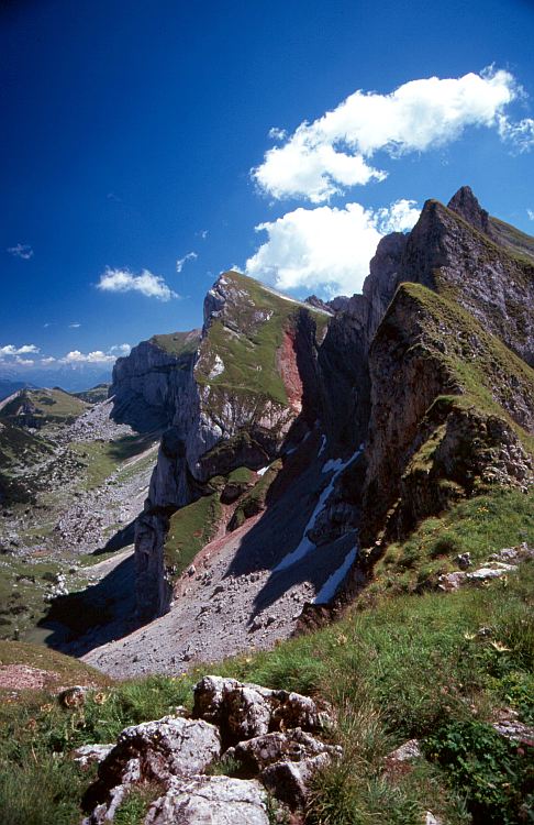 Auf dem Spieljoch (2236 m). Im Rofangebirge wechseln grüne Grashänge ab mit schroffen Felspartien. Hier Nordabstürze.