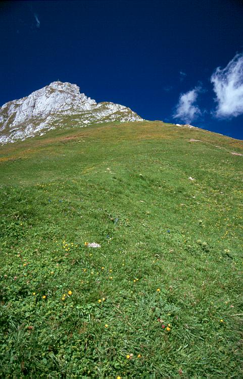 Auf dem Spieljoch (2236 m). Sanfte grüne Grasmatten, darüber der felsige Gipfelaufbau des Hochiss (2299 m).