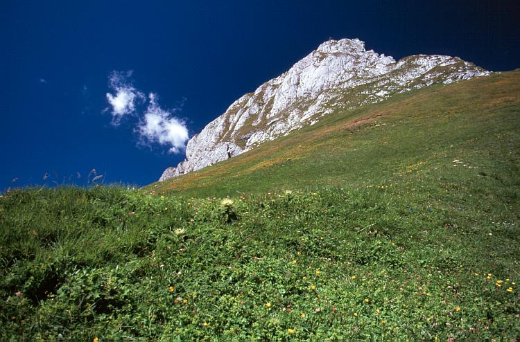 Sanfte grüne Grashänge, darüber thront felsig und hell der Hochiss (2299 m).