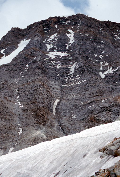Ganz oben läßt sich in 3817 m Höhe das Refuge de l`Aiguille du Goûter ausmachen. Im Vordergrund der Glacier de Tête Rousse.