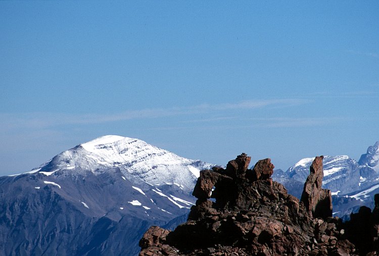 Irgendein plattiger, schneebedeckter Gipfel. Weiter hinten schließen sich rechts die Berge des Berner Oberlandes an.