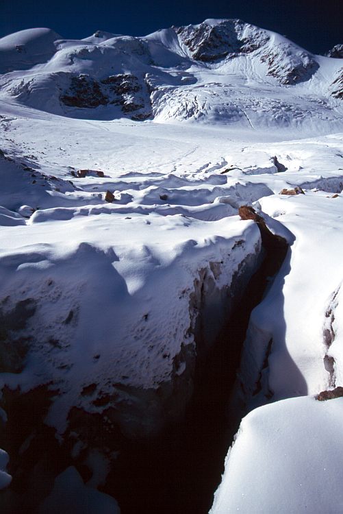Tiefe Spalten im Suldenferner, deren Grund nicht einsehbar ist. In der Bildmitte das Schrötterhorn (3386 m).