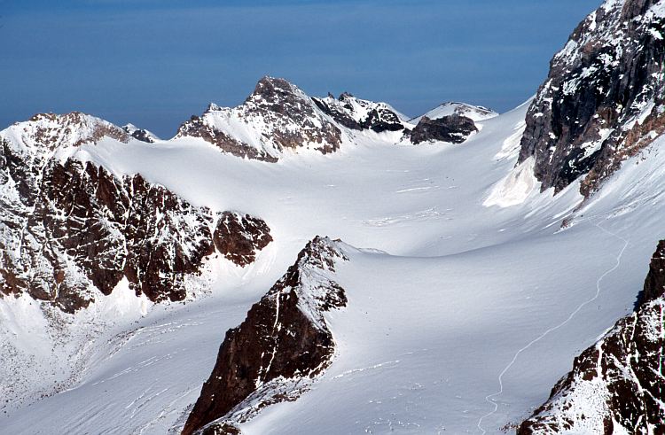 Über dem weiten Gletscherfeld des Vedretta del Gran Zebrù erhebt sich die Pale Rosse (3346 m).