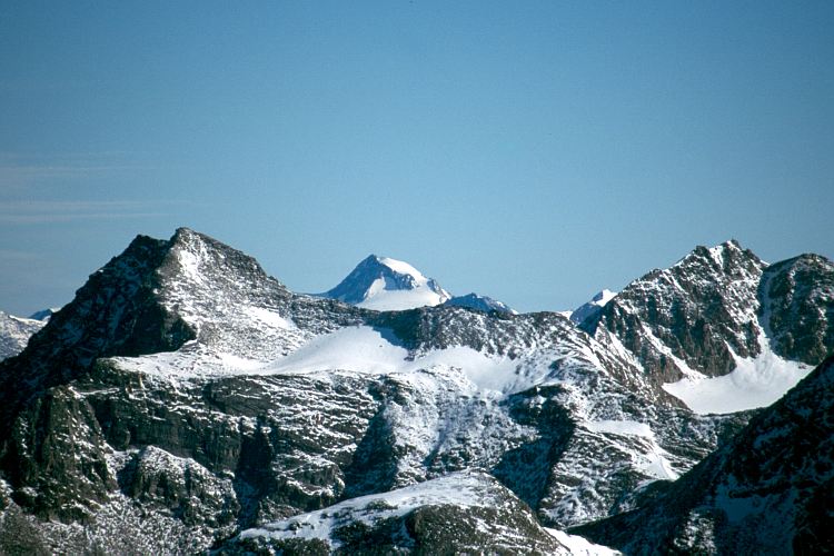 Links die Vertainspitze (3545 m). Im Hintergrund, jenseits des Etschtales und bereits in den Ötztaler Alpen, die Weißkugel (3739 m).