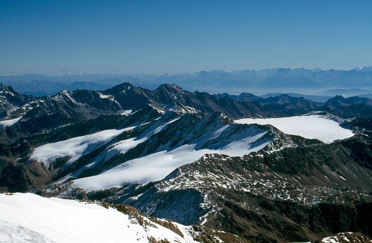 Schranferner links. Etwas rechts der Hinteren Schran Spitze liegt die