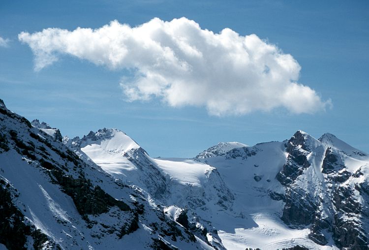 Die Trafoier Eiswand (3565 m) links hinten in der Sonne. Rechts die Mittlere Madatsch Spitze (3313 m).