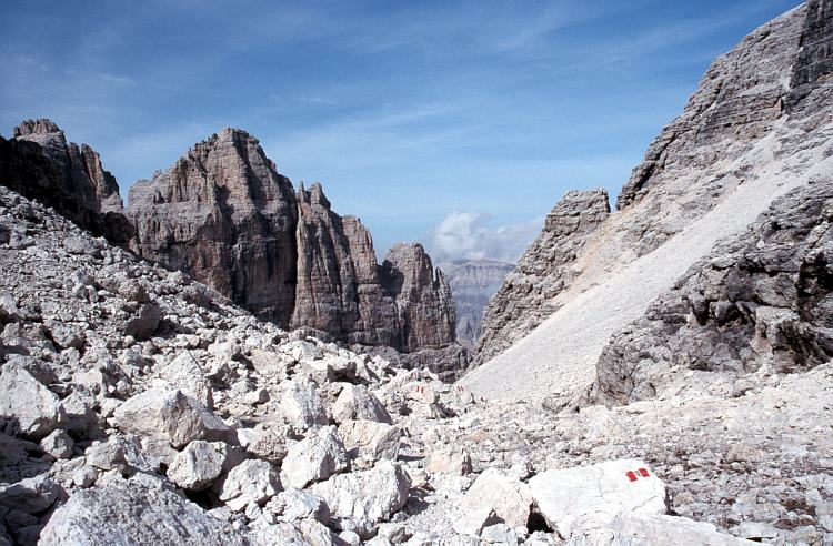 Im Sella-Massiv. Steiniger Anstieg zur Pisciadù Spitze (2985 m) rechts.