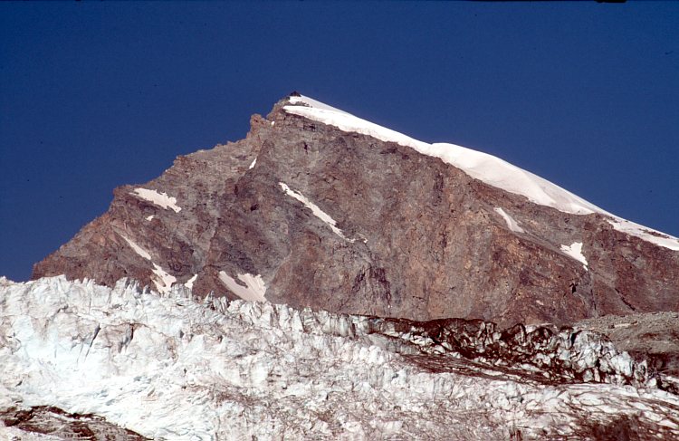 Allalinhorn (4027 m); unter der Südwand der Allalingletscher. Nach rechts der Ostgrat oder Hohlaubgrat.